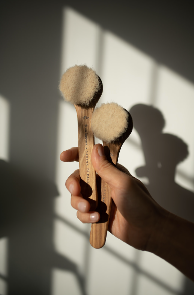 Very soft dry brushes that were made in Sweden and come in a pair to stimulate both sides of the face at the same time. Each brush is made by hand by visually impaired craftsmen.